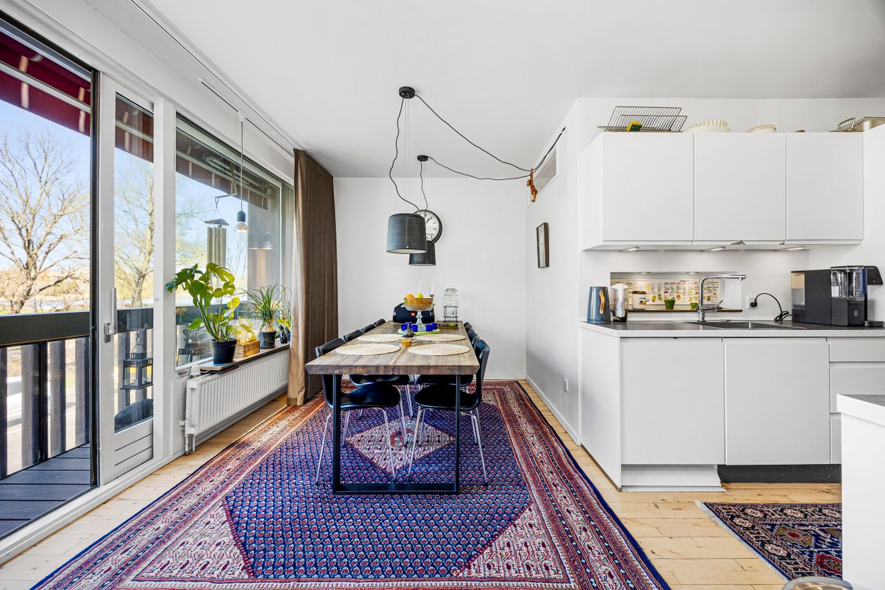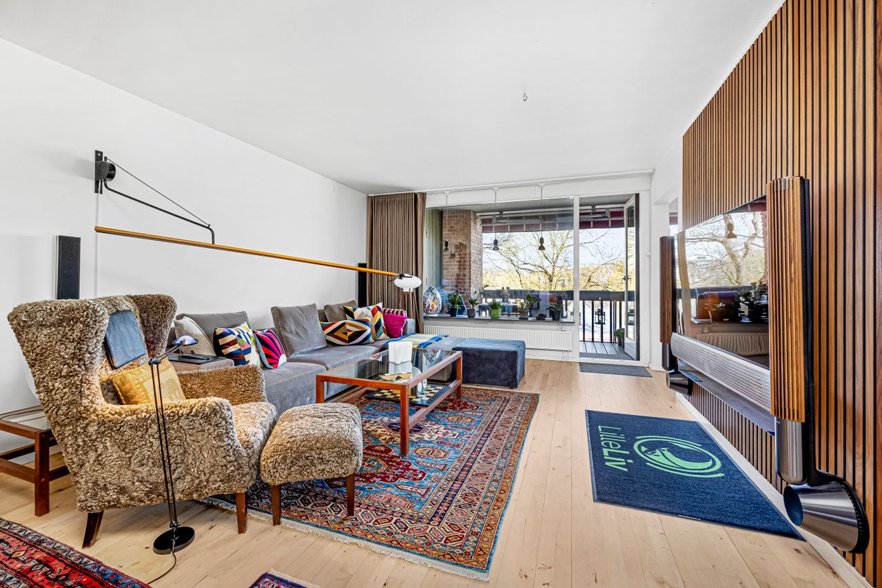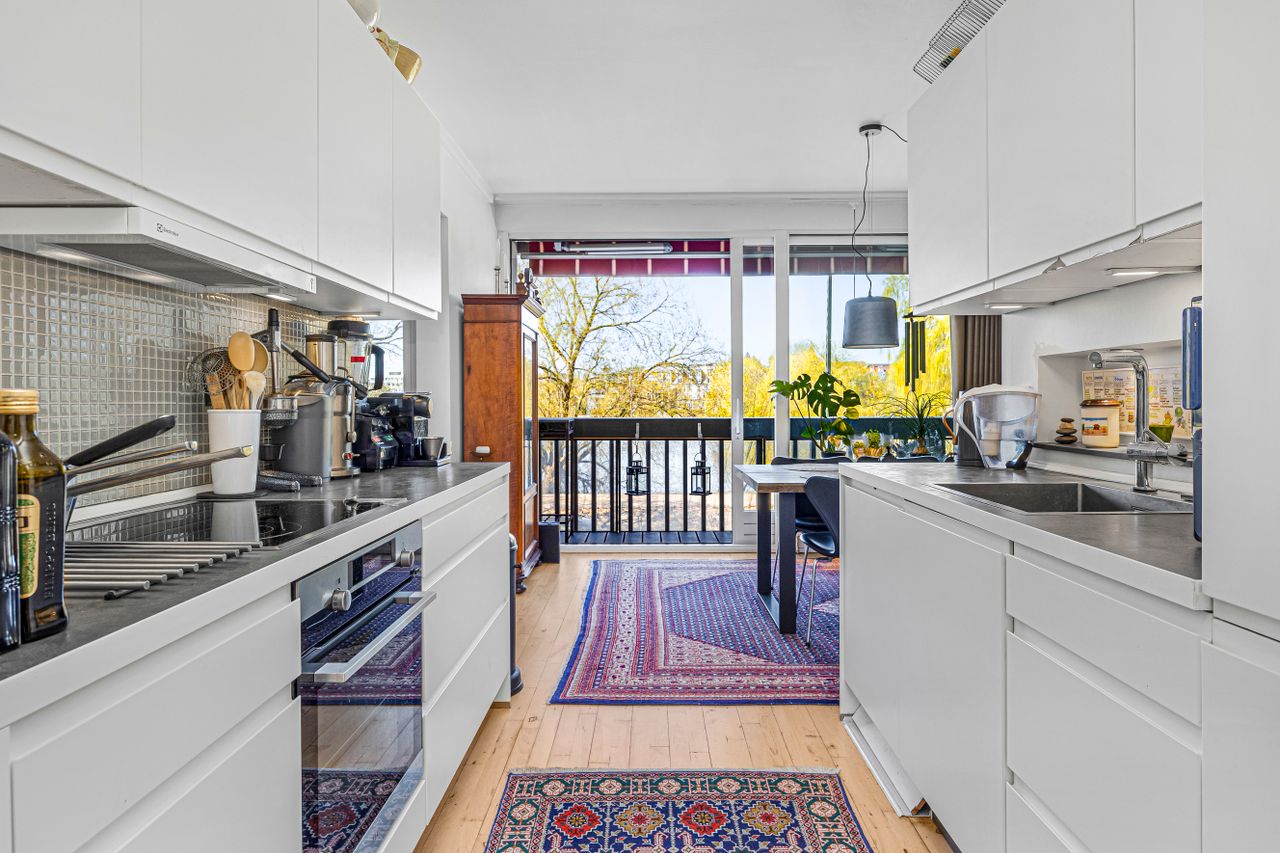 Lejligheden byder på en optimal planløsning med en rummelig entré, der fordeler til boligens øvrige rum. Hjertet i hjemmet er den store, lyse stue med plads til både sofa, samt spiseafdeling og med direkte udgang til en dejlig altan, hvor udsigten over søerne virkelig kommer til sin ret.