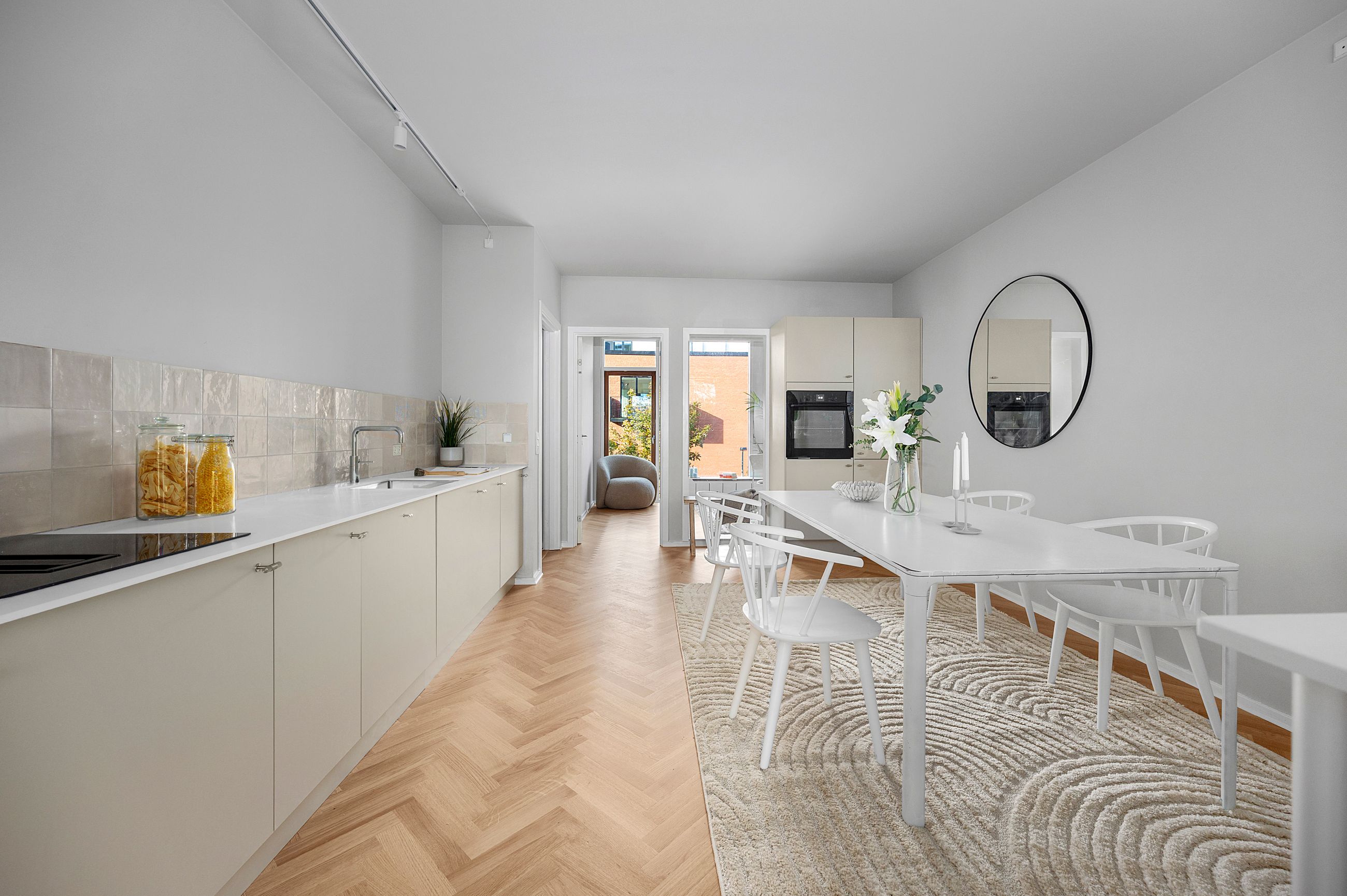 Boligens hjerte er det åbne køkken-alrum, der smelter sammen med stuen i ét indbydende opholdsrum – perfekt til både hverdag og gæster. Fra stuen er der udgang til den store altan, hvor du kan nyde solen og kigget mod det maritime nærmiljø.