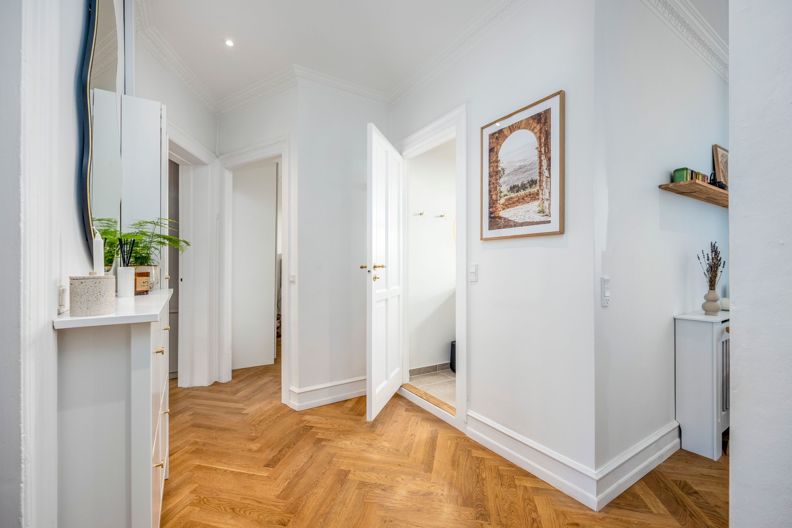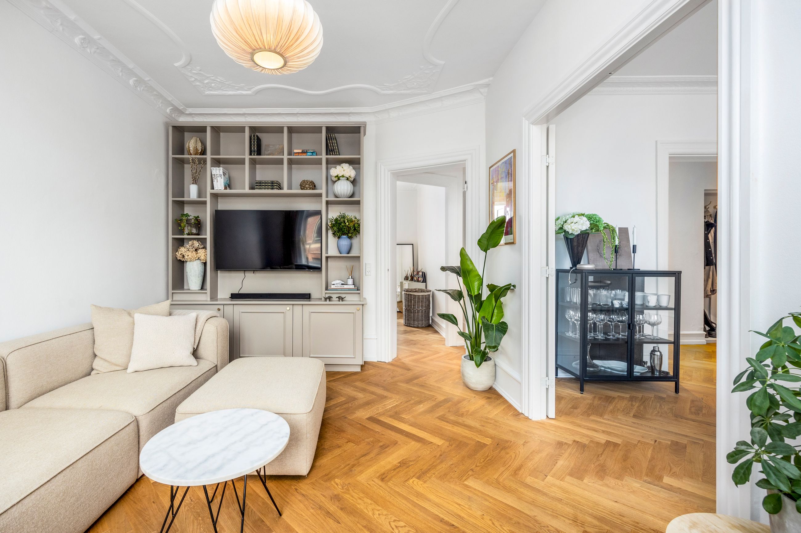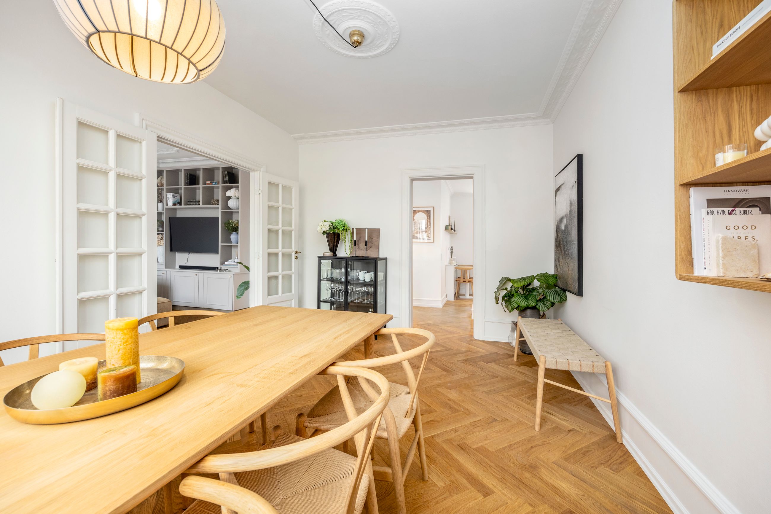 Lejligheden er totalrenoveret i 2024/2025 med kvalitetsmaterialer som massiv sildebensgulv i egetræ, Invita-køkken med quartzite bordplade, messinggreb og badeværelse med italienske fliser. Samtidig er originale detaljer som stuk, paneler og klassiske dørgreb bevaret, så boligen fremstår som en moderne fortolkning af den klassiske Frederiksberg-lejlighed.
