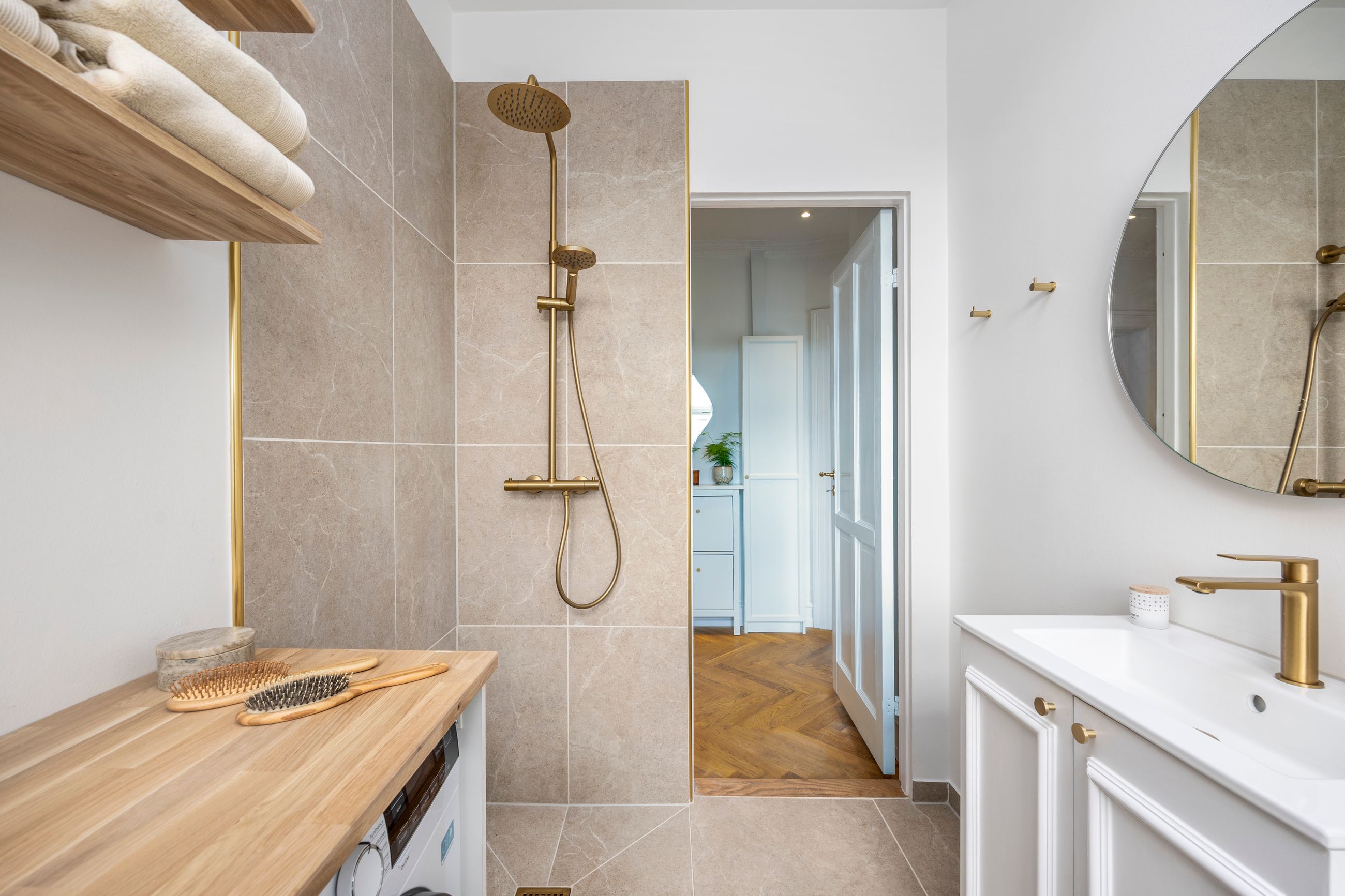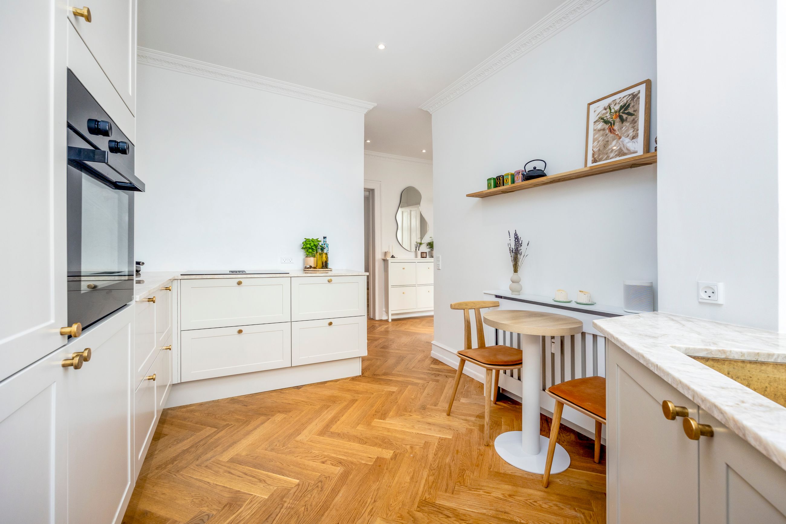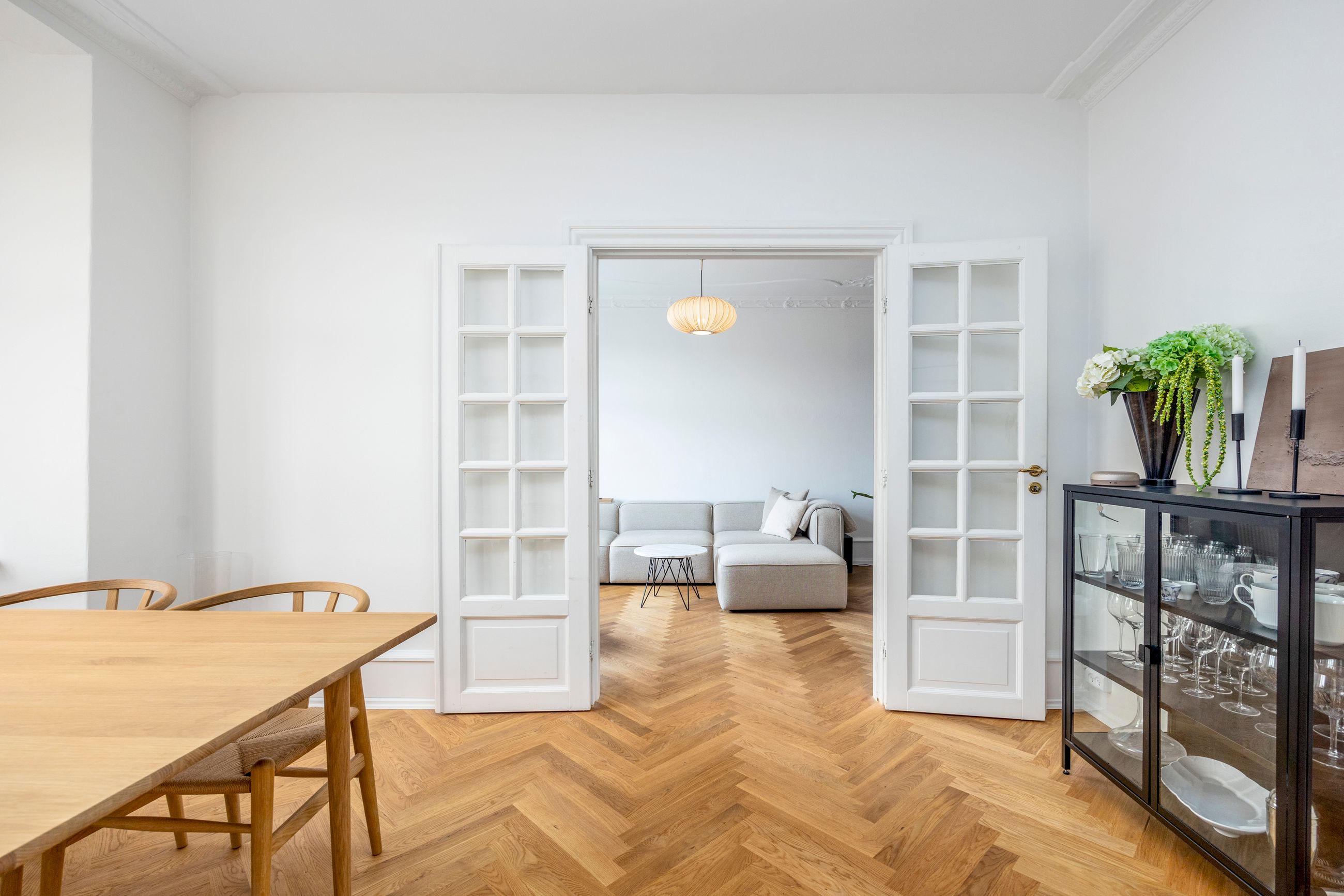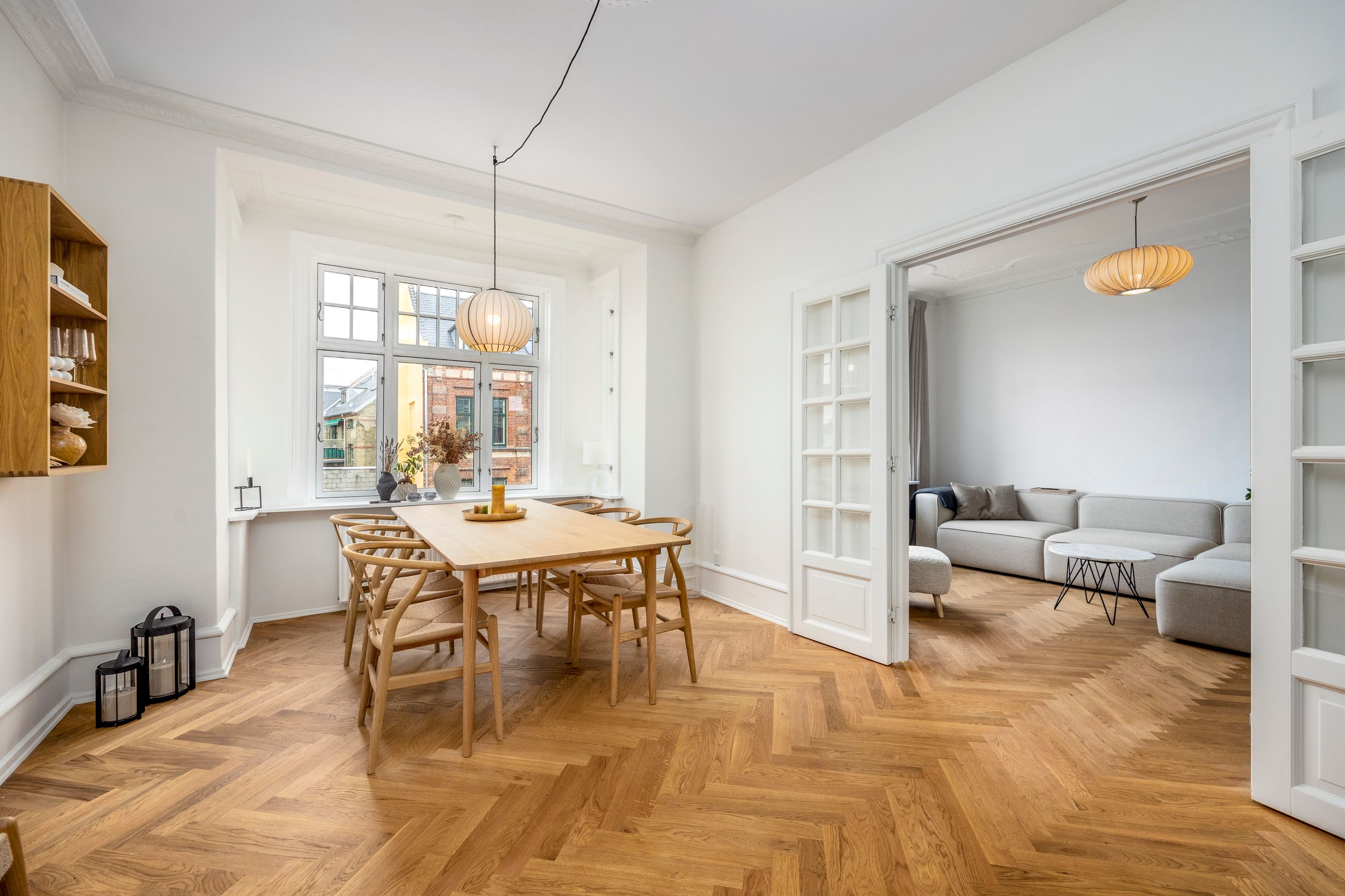 Lejligheden er totalrenoveret i 2024/2025 med kvalitetsmaterialer som massiv sildebensgulv i egetræ, Invita-køkken med quartzite bordplade, messinggreb og badeværelse med italienske fliser. Samtidig er originale detaljer som stuk, paneler og klassiske dørgreb bevaret, så boligen fremstår som en moderne fortolkning af den klassiske Frederiksberg-lejlighed.