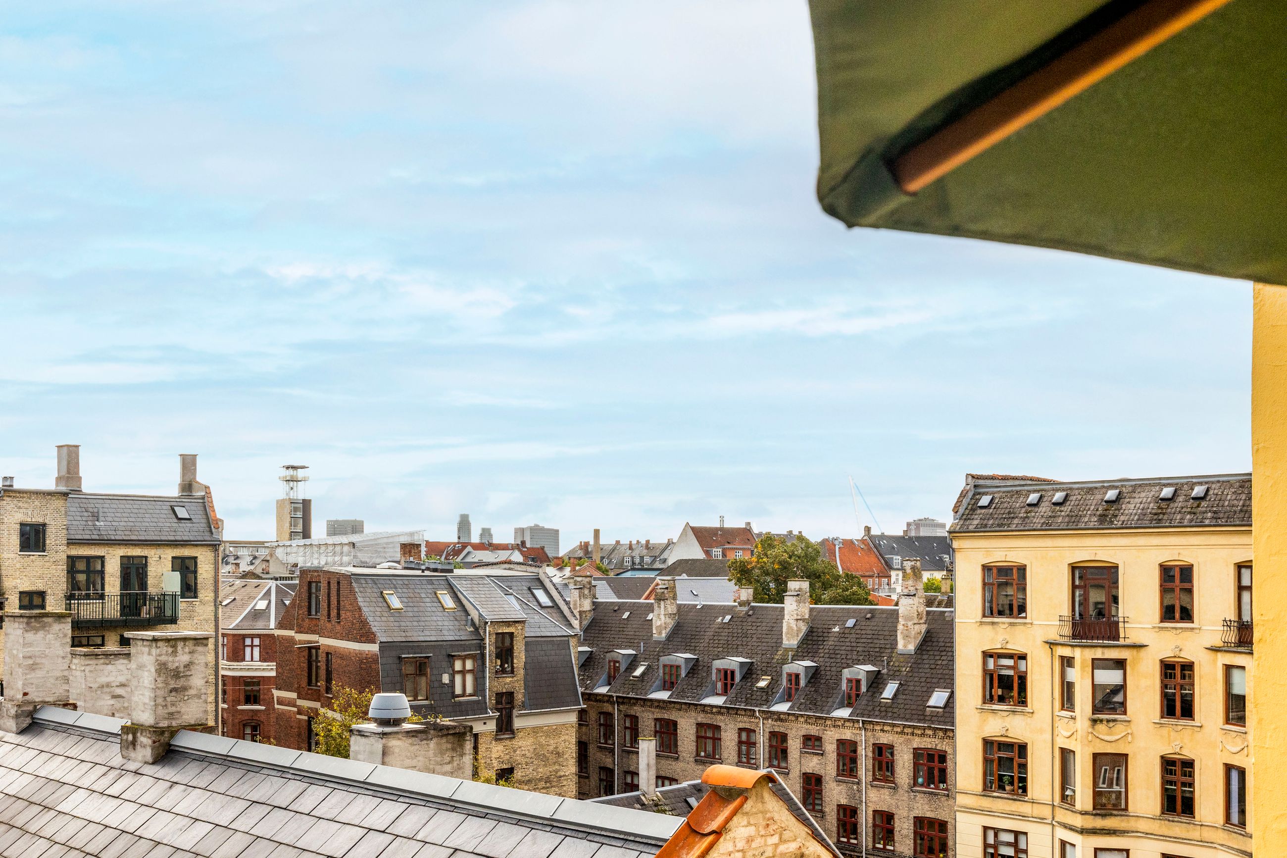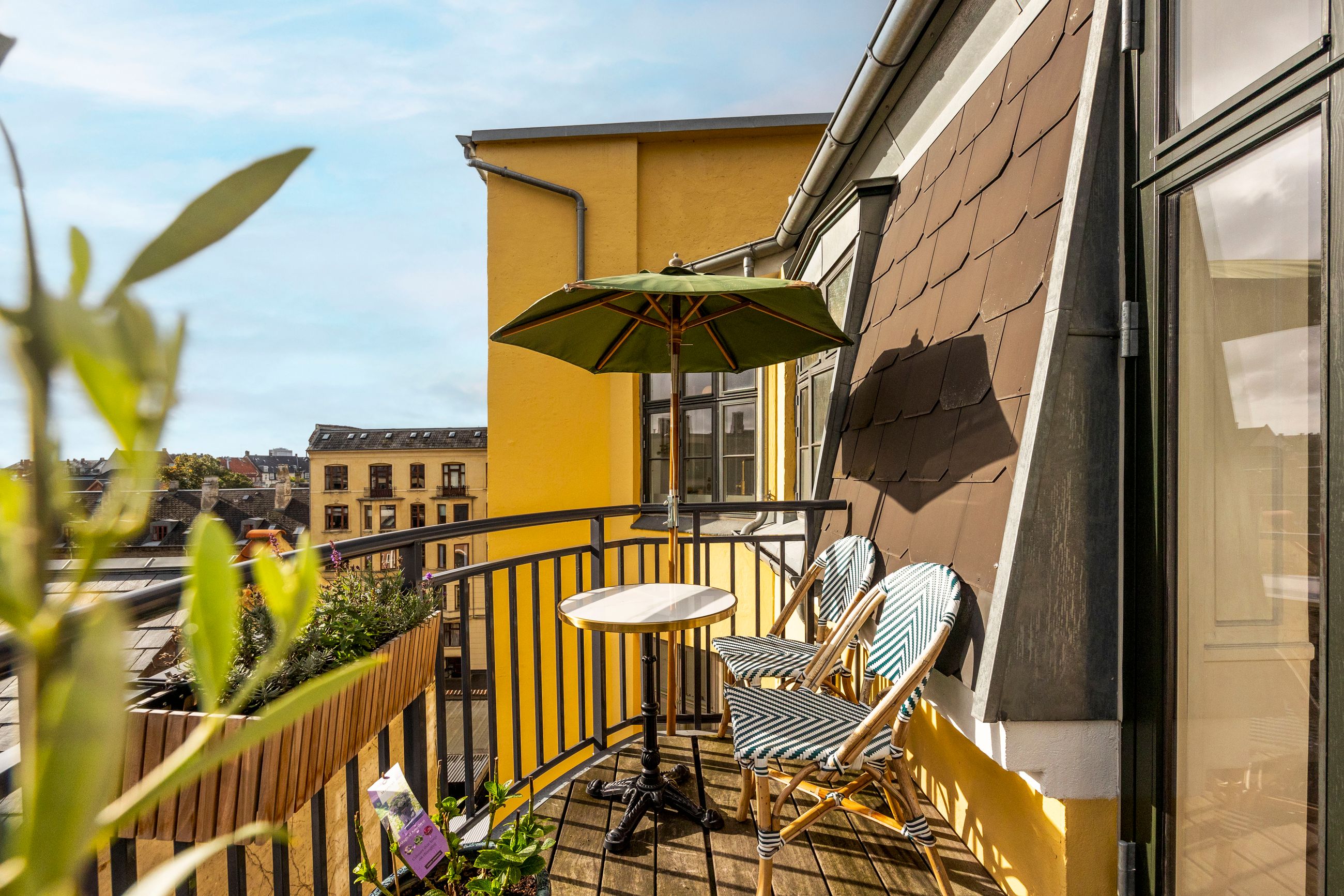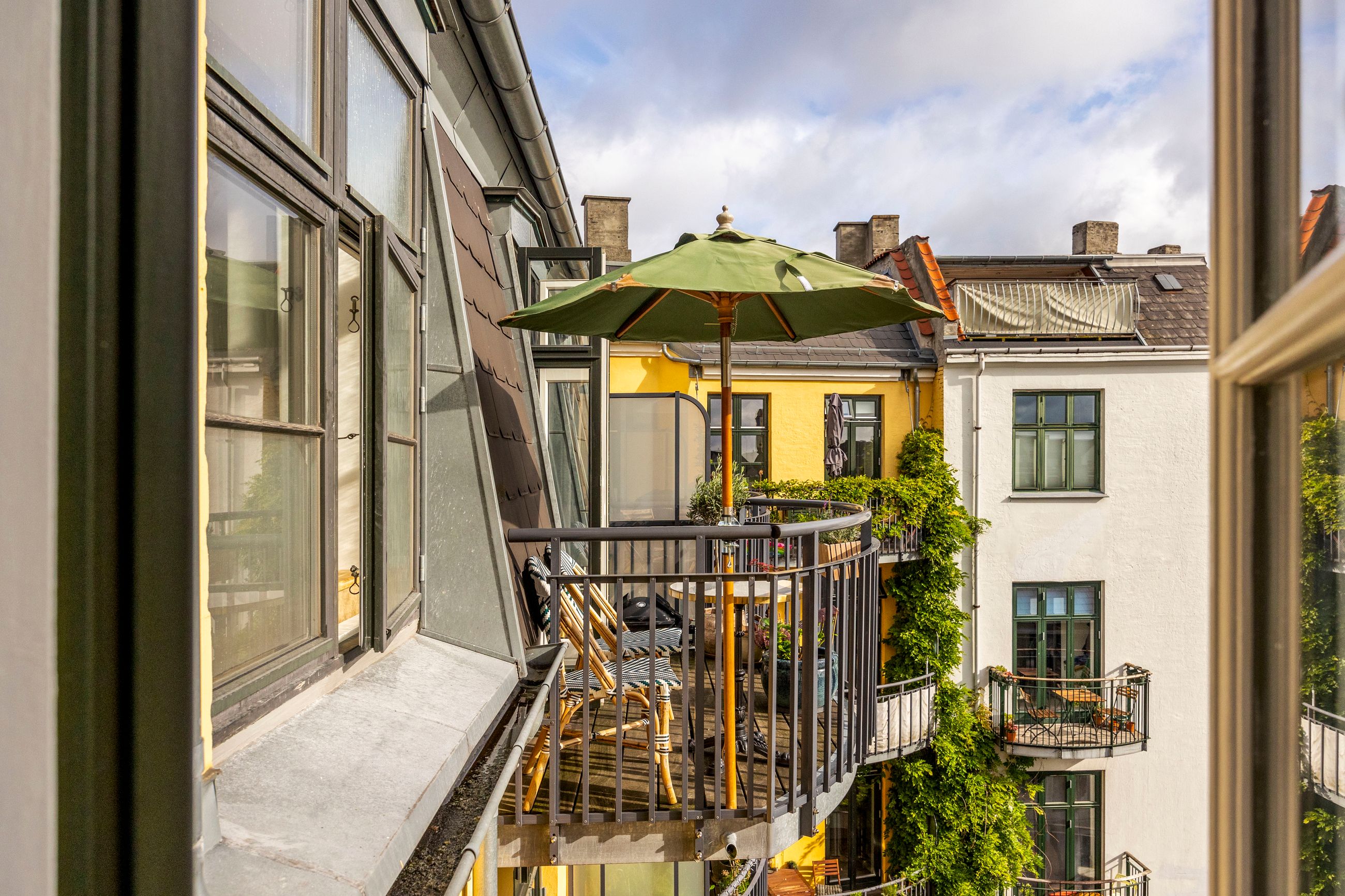 Planløsningen er funktionel. Fra entréen kan du træde ind i en lys og elegant dobbeltstue en suite, hvor store vinduespartier lukker sollyset ind og giver et smukt kig ud over byens tage. Fra soveværelset er der adgang til en stor østvendt altan, og i stuen er der desuden etableret en indbygget reol, der på smukkeste vis understreger boligens herskabelige udtryk.