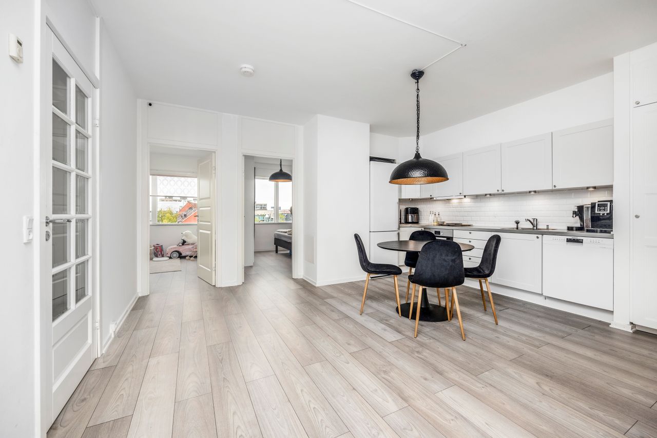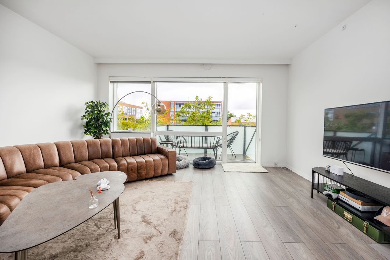 Denne dejlige andelsbolig på 91m² byder på et stort og lyst åbent køkken-alrum, der skaber en rummelig og sammenhængende opholdsstue, hvor familie og venner kan samles. Boligen har to soveværelser, der begge har god plads og masser af lysindfald – ideelle som soveværelse, børneværelse eller kontor.
